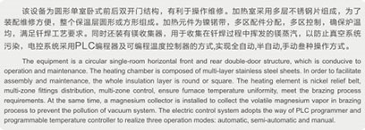 该设备为圆形单室卧式前后双开门结构,有利于操作维修。加热室采用多层不锈钢片组成,为了装配维修方使,整个保温层圆形或方形组成。加热元件为镍锘带,多区配件分配,多区控制,确保炉温均,满足钎焊工艺要求。同时还装有镁收集器,用于收集在钎辉过程中挥发的镁蒸汽,以防止真空系统污染,电控系统采用PLC编程器及可编程温度控制器的方式实现全自动,半自动,手动叁种操作方式